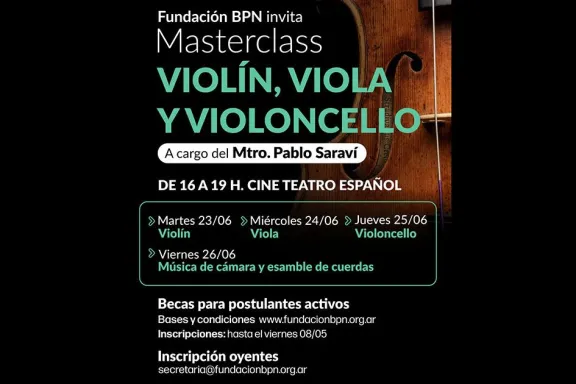 La masterclass de violín, viola y violonchelo será dictada por el maestro Pablo Saraví en el mismo lugar en junio, el martes 23 (violín), miércoles 24 (viola), jueves 25 (violonchelo) y viernes 26 (música de cámara y ensamble), siempre de 16 a 19.