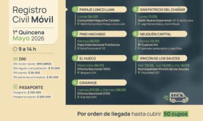El cronograma de trabajo del Registro Civil Móvil para la primera quincena de mayo comprende diversas localidades de la provincia a fin de acercar servicios esenciales a la comunidad. El organismo dependiente del ministerio de Gobierno, Mujeres y Diversidad, iniciará su recorrido el lunes 4 de mayo en el paraje Lonco Luán, donde atenderá consultas y trámites de la comunidad mapuche Catalán.